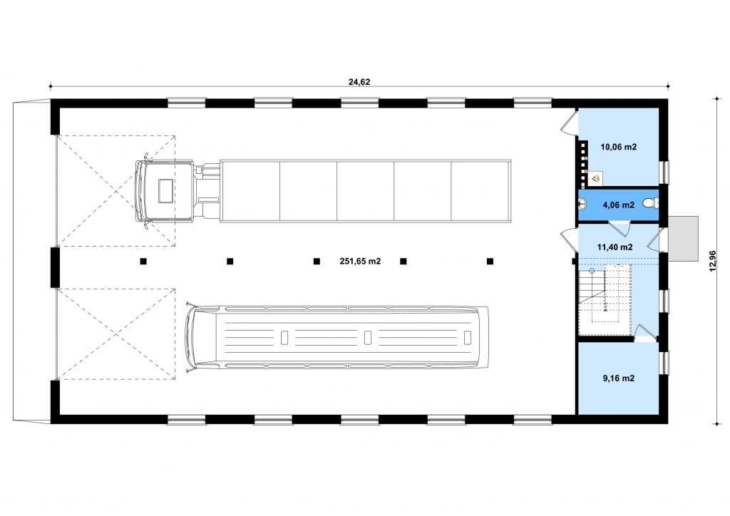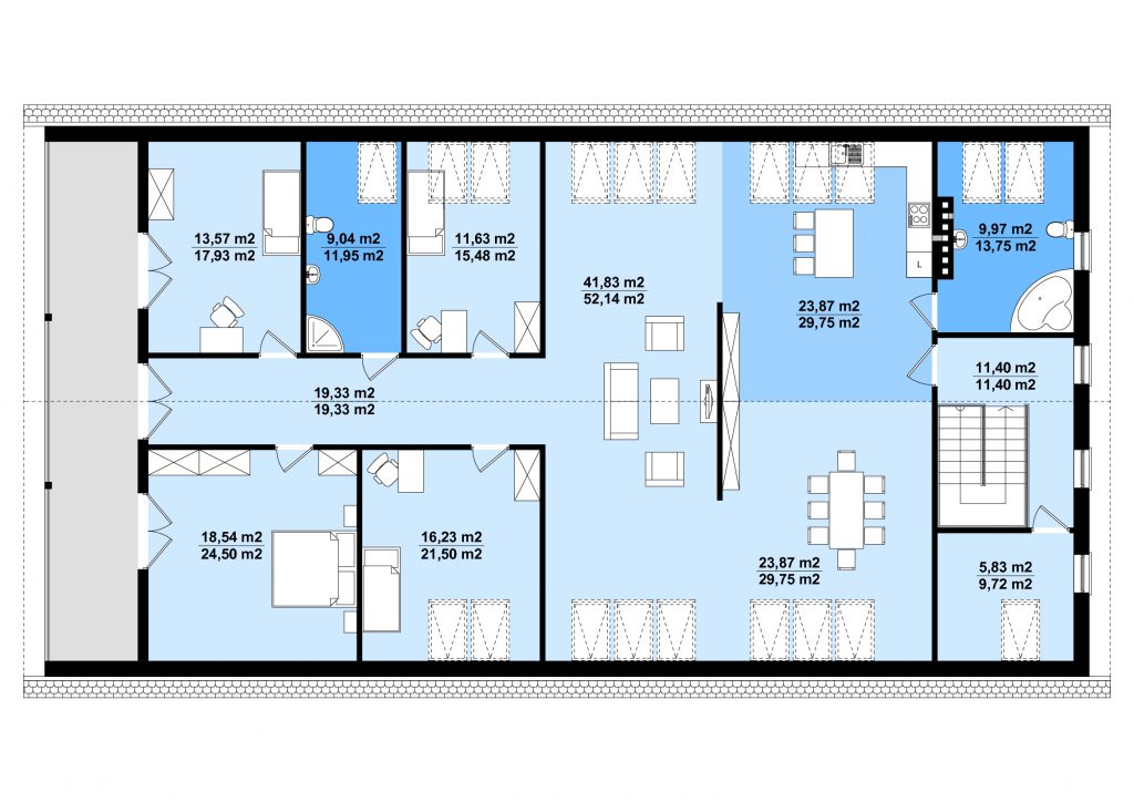 Projekt budynku mieszkalnego, parterowego, niepodpiwniczonego z poddaszem mieszkalnym, kuchnią, jadalnią, salonem, czterema pokojami, trzema łazienkami, garażem dwustanowiskowym, przeznaczonym dla samochodów ciężarowych, i antresolą. Do projektu dołączone jest zestawienie: stali, więźby dachowej oraz stolarki drzwiowej, jak również bezpłatna zgoda na dokonanie zmian.