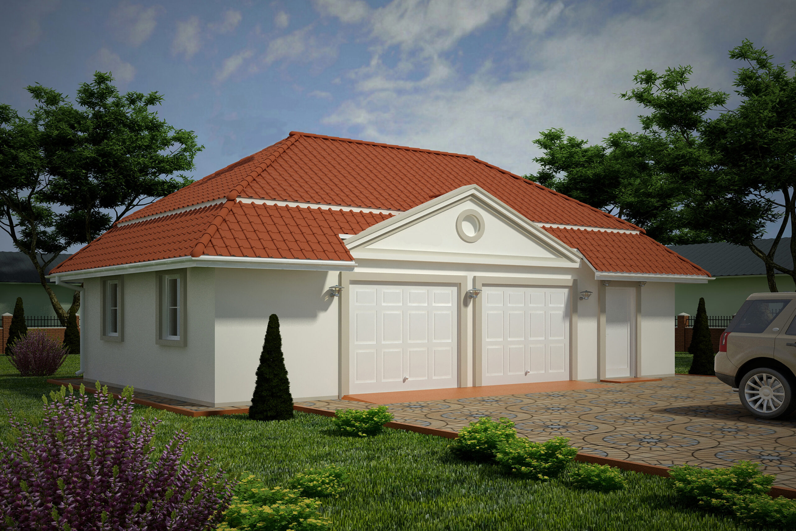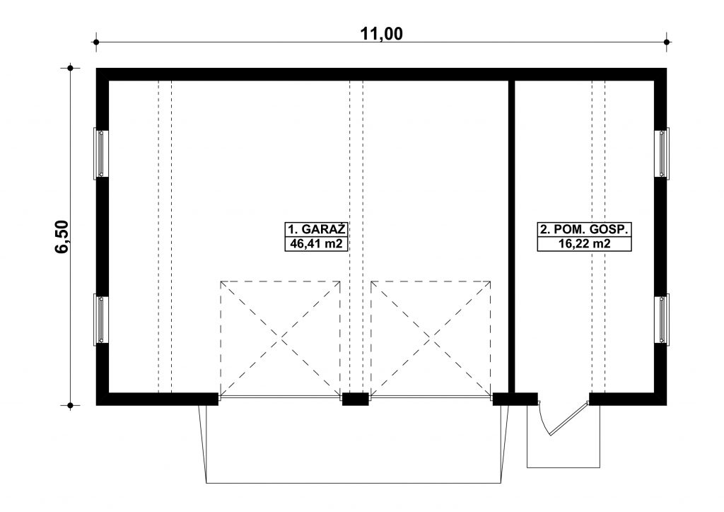 Projekt garażu dwustanowiskowego, parterowego, niepodpiwniczonego, przeznaczonego dla samochodów osobowych z pomieszczeniem gospodarczym. Do projektu dołączone jest zestawienie: stali, więźby dachowej oraz stolarki drzwiowej i okiennej, jak również bezpłatna zgoda na dokonanie zmian.